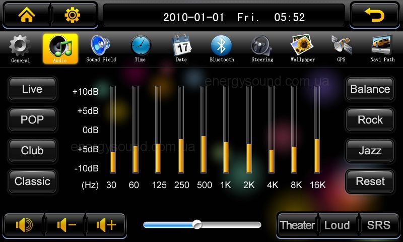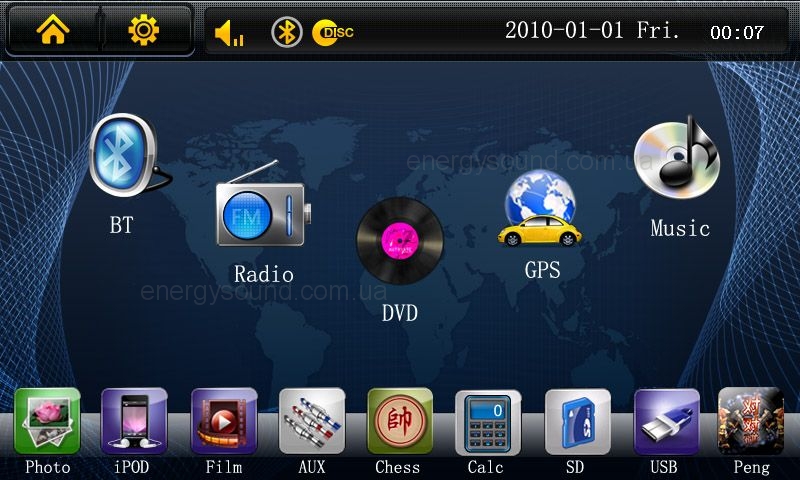 Данный мультимедийный центр имеет огромный 7-дюймовый монитор с цифровым сенсорным экраном высокого разрешения (800х480), DVD проигрователь, который считывает все известные видео- и аудиоформаты MP4, DivX, XViD, MPEG2, MPEG4, DVD, MP3, WMA, JPEG, BMP, возможность подключения носителей USB, DVD, TV- и радиоприёмник, усовершенствованный GPS-навигатор, поддерживающий карты iGO8, Автоспутник, Навител. Вдобавок автомагнитола оснащена входом для камеры заднего вида и Bluetooth профилем hands-free для подключения телефона.